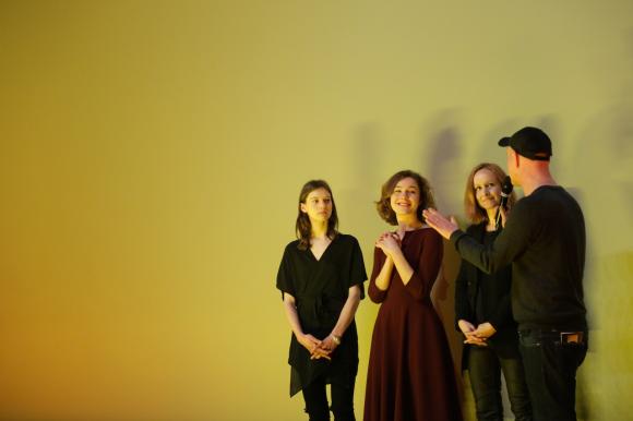 Nuotraukoje - aktorės Julija Steponaitytė, Aistė Diržiūtė ir režisierė Alantė Kavaitė atsakinėja į žiūrovų klausimus Tarptautiniame Berlyno kino festivalyje.