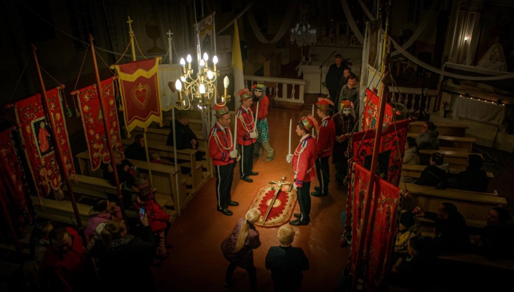 Kai sutemus šurmulingieji apeigų žiūrovai išsiskirsto iki ryto, o bažnyčioje lieka tik smalsiausi ir išdykiausi vaikai, stebintys budinčius kareivėlių kvartetus ir persirengėlių pokštus, režisierė savo kūrinyje nutildo realiuosius garsus. Tada ateina laikas latvių kompozitoriaus Vestards Šimkus muzikai, o kino kamera iš labai arti įsižiūri į jau pažįstamus „mėlynųjų“, „raudonųjų“, „žaliųjų“ ir „baltųjų“ veidus. Surimtėjusius, susikaupusius, jau ir bepavargstančius. Be galo gražius. Galbūt tie jauni žmonės sakėsi esą čia tik dėl papročio, pareigos ar kad „mama liepė“, galbūt neseniai jie patys dūko bažnyčioje kaip tie dabartiniai patrakėliai, gal ir pasvajodavo kada pastovėti su uniformom ir mediniais kardais – dabar jie kantriai budi, pasitraukę iš kasdienybės, ir čia tas atvejis, kai ne aktorius kuria gautą vaidmenį, o vaidmuo kuria žmogų. Per amžių amžius. Gal tai ir yra sacrum, išaugantis iš daugelio kadre matomų ir nematomų profanum.