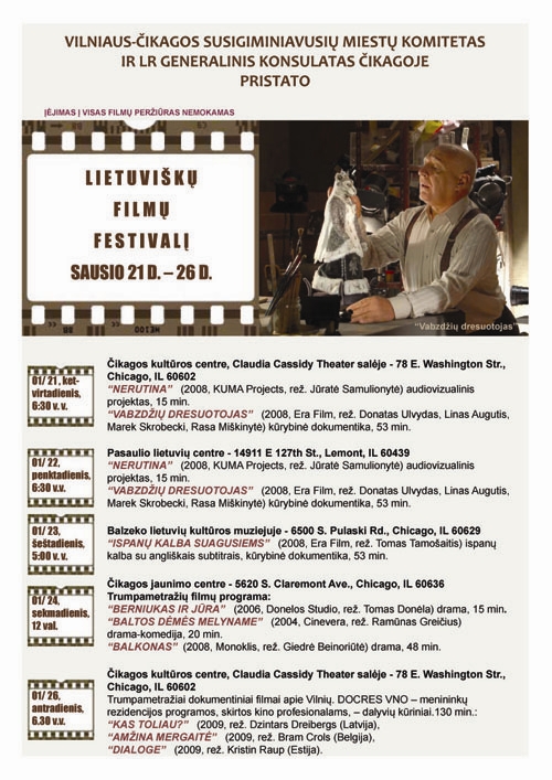 Čikagoje įvyks lietuviškų filmų festivalis. Jo atidarymas - sausio 21 d., ketvirtadienį, Čikagos kultūros centre, Claudia Cassidy salėje, kitos filmų peržiūros vyks Pasaulio lietuvių centre, Balzeko lietuvių kultūros muziejuje bei Čikagos jaunimo centre. Šiuolaikinio lietuviško kino kūrėjų darbus pristatys kino kompanijos „Era Film“ direktorė ir prodiuserė Rasa Miškinytė. Po peržiūrų vyks klausimų-atsakymų sesijos. Festivalis baigsis sausio 26 d. dokumentinių filmų apie Vilnių programa.