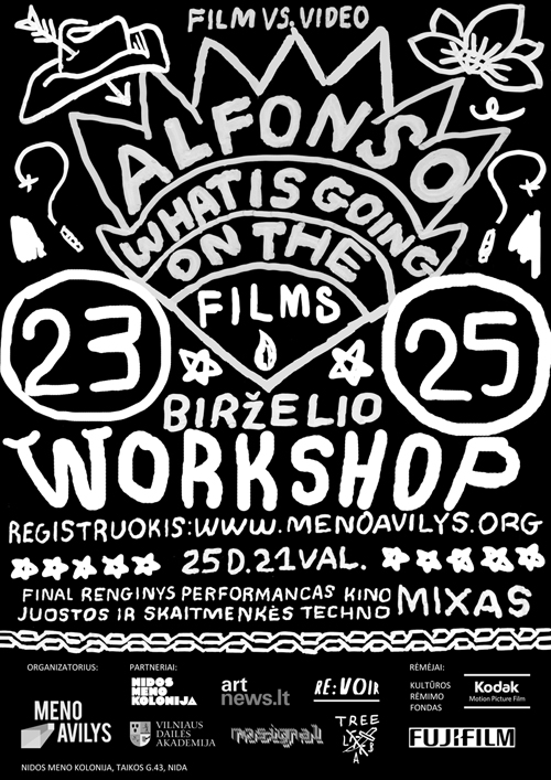 Dirbtuvių „Alfonso, what is going on the films?“ metu filmų kūrėjai Pip Chodorov (Prancūzija) ir Vassily Bourikas (Graikija) kartu su jauna menininke Rasa Juškevičiūte dirbtuvėse dalyvaujančius kino juostos entuziastus mokys filmuoti 8 mm kameromis, išgauti unikalius, tik kino juostai būdingus efektus, patiems ją ryškinti. Eksperimentavimą su skaitmeniniu formatu pasirinkę dalyviai, su video menininkų bei vidžėjų – Max Voitech (Latvija), Vaclovo Nevčesausko, Vytauto Narbuto ir Roko Tarabildos – pagalba, mokysis skirtingais būdais manipuliuoti vaizdais.