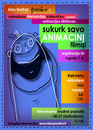 Animacijos dirbtuvės kino teatre startuoja nuo rugsėjo 6 dienos ir vyks kiekvieną antradienį 17 valandą. Penkiolikos paskaitų ciklo metu jaunieji animatoriai susipažins su pagrindinėmis animacijos technikomis ir vieną jų išbandys kurdami savo animacinį filmą. „Po dirbtuvių, kaip ir dera, organizuosime filmų premjerą! Visus kūrėjus pakviesime į iškilmingą jų kurtų animacinių filmų peržiūrą kino teatre” – smagiomis smulkmenomis dalinasi A. Adomėnė.